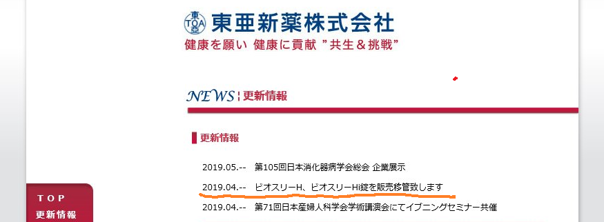 2019.04.–ビオスリーH、ビオスリーHi錠を販売移管致します出典:東亜新薬株式会社のHP
