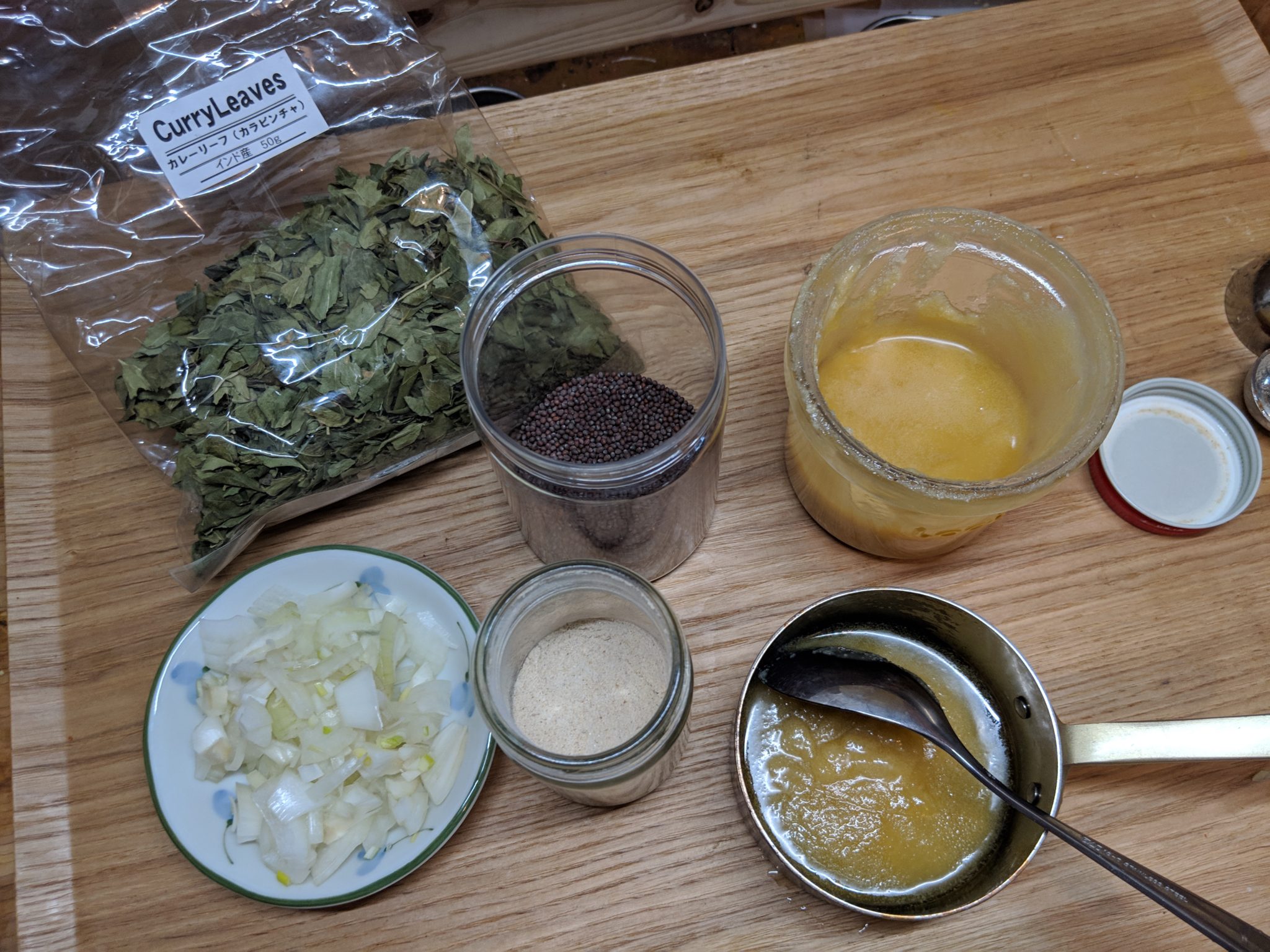 ①ギー大さじ3くらいとマスタードシード小さじ1位を小鍋に入れて火にかける(火力🔥弱~中)