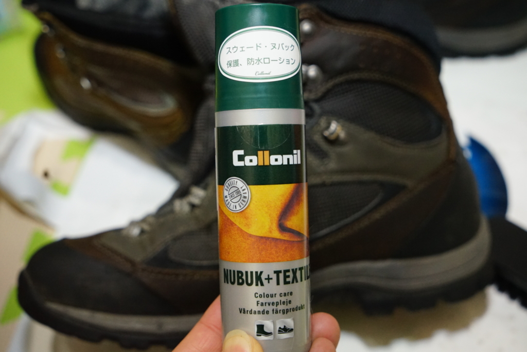 靴の水分が飛んで乾いたら、表面に防水スプレーを塗布する。