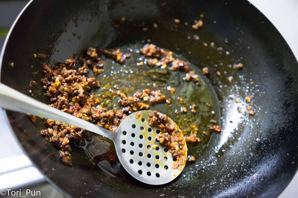 →赤かった花椒が黒っぽくなってきます。このタイミングで