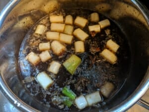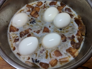▶水 1000cc、醤油 大匙4、お酒 大匙4、砂糖 大匙3、オイスターソース 大匙2強、八角 2個~、ネギ全部