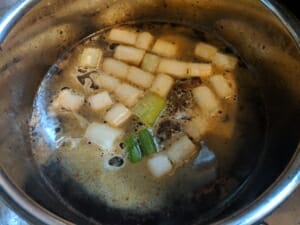 [工程3]鍋に調味料とネギを投入