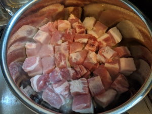 炒め油を鍋に敷いて豚肉の脂身を下にして鍋に並べる
